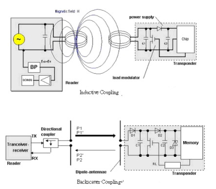 以RFID 卡片閱讀器及電子標(biāo)簽之間的通訊及能量感應(yīng)方式來看大致上可以分成, 感應(yīng)偶合(Inductive Coupling) 及后向散射偶合(Backscatter Coupling)兩種, 一般低頻的RFID大都采用第一種式, 而較高頻大多采用第二種方式。
