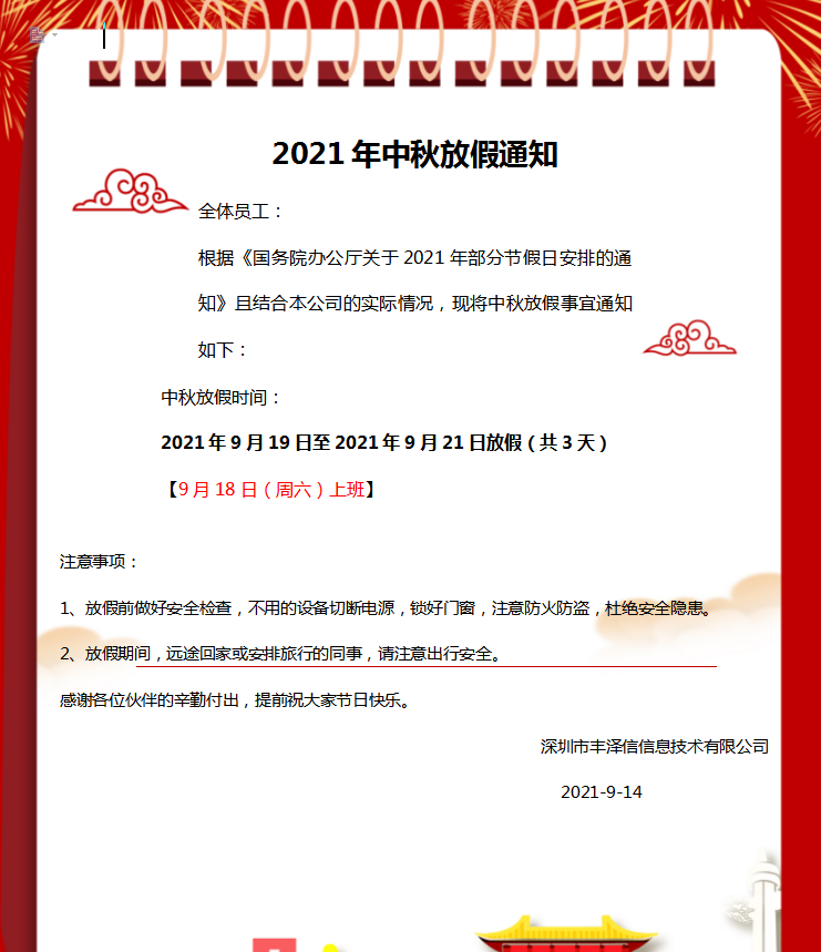 2021年中秋放假通知