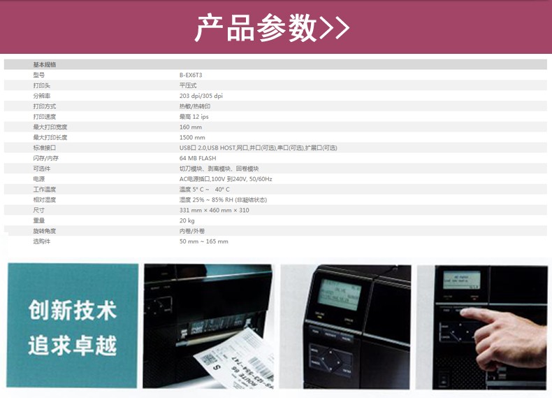 具有12IPS打印速度、結(jié)合打印溫度和步進(jìn)控制技術(shù),能滿足各類標(biāo)簽打印的需求,懸壓打印技術(shù)和碳帶節(jié)省功能,能降低客戶使用成本,提升投資回報(bào)率。EX6T3堅(jiān)固耐用,擁有平壓打印及居中打印技術(shù)的同時(shí),結(jié)合多種人性化、智能化設(shè)計(jì),提供寬幅工業(yè)標(biāo)簽打印應(yīng)用。廣泛的應(yīng)用領(lǐng)域:物流運(yùn)輸 / 制造 / 化工 / 鋼鐵 / 電力行業(yè) 聯(lián)系人:李先生 手機(jī):18929304946 陳小姐(業(yè)務(wù)):189293049