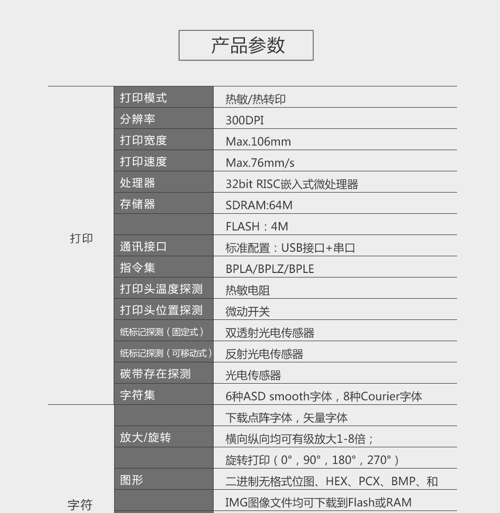 產(chǎn)品詳情打印參數(shù) ? 打印方式: 熱敏/熱轉(zhuǎn)印 ? 分辨率:12點(diǎn)/毫米(300 DPI) ? 打印寬度: 108 mm(Max.) ? 打印速度: 76mm/s(300DPI) ? 存儲(chǔ)器: SRAM:2MB 主板FLASH:1MB 擴(kuò)展存儲(chǔ)卡FLASH: 8MB&nbs